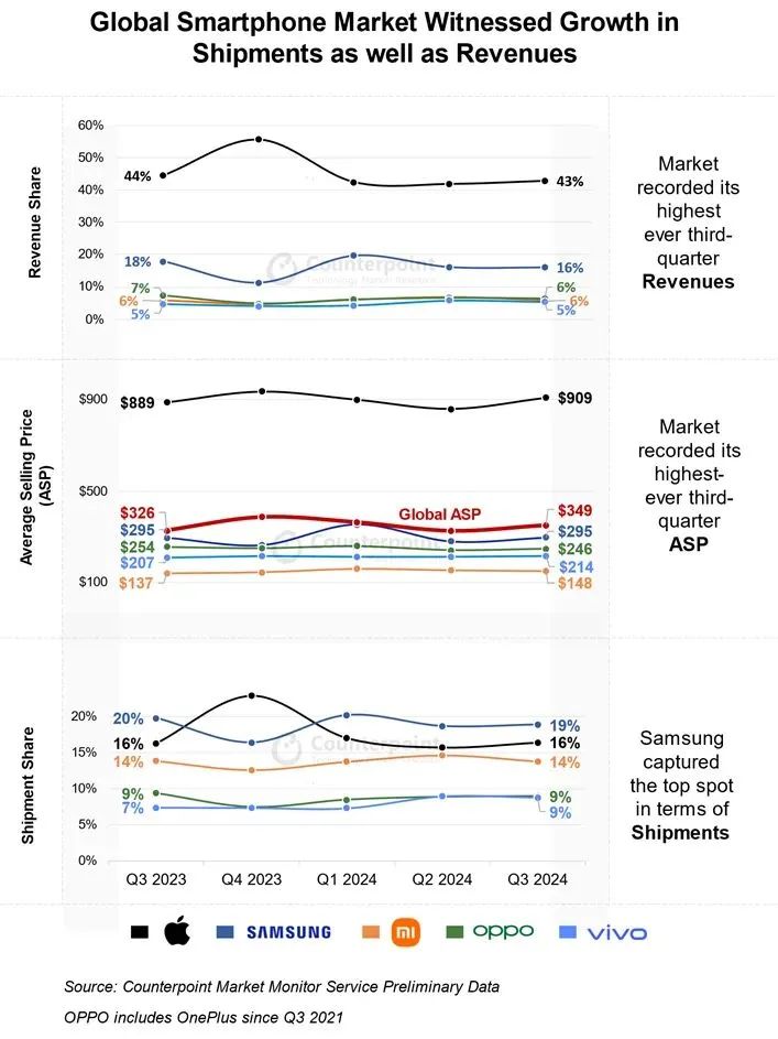 数据裸露,2024年第三季度,公共智高手机商场同比增长2%,出货量达到3.07亿部。公共智高手机收入同比增长10%,平均售价增长7%。收入和平均售价均创下历史新高。三星在出货量方面陆续领跑商场,占据19%的销量份额。苹果在营收方面最先,并创下了其积年第三季度出货量、收入和平均售价的最高记载。小米位居第三,收入增长跳跃出货量增长比例,而OPPO则位居第四。vivo在前五大手机品牌厂商中同比增长最快。