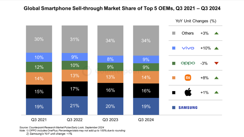 字据Counterpoint Research清晰,2024年第三季度公共智高手机销量同比增长2%,这是自2018年第三季度以来初次在第三季度完了同比增长。拉丁好意思洲、西欧和日本的增长率最高。三星和苹果(AAPL.US)在该季度同比销量与客岁比较捏平,苹果在9月成为销量第一的品牌,这收获于iPhone 16的提前发布。在前五名以外,摩托罗拉和华为引颈了商场的增长要领,销量增长了近30%。摩托罗拉和谷歌(GOOGL.US)录得有史以来最高的季度销量。