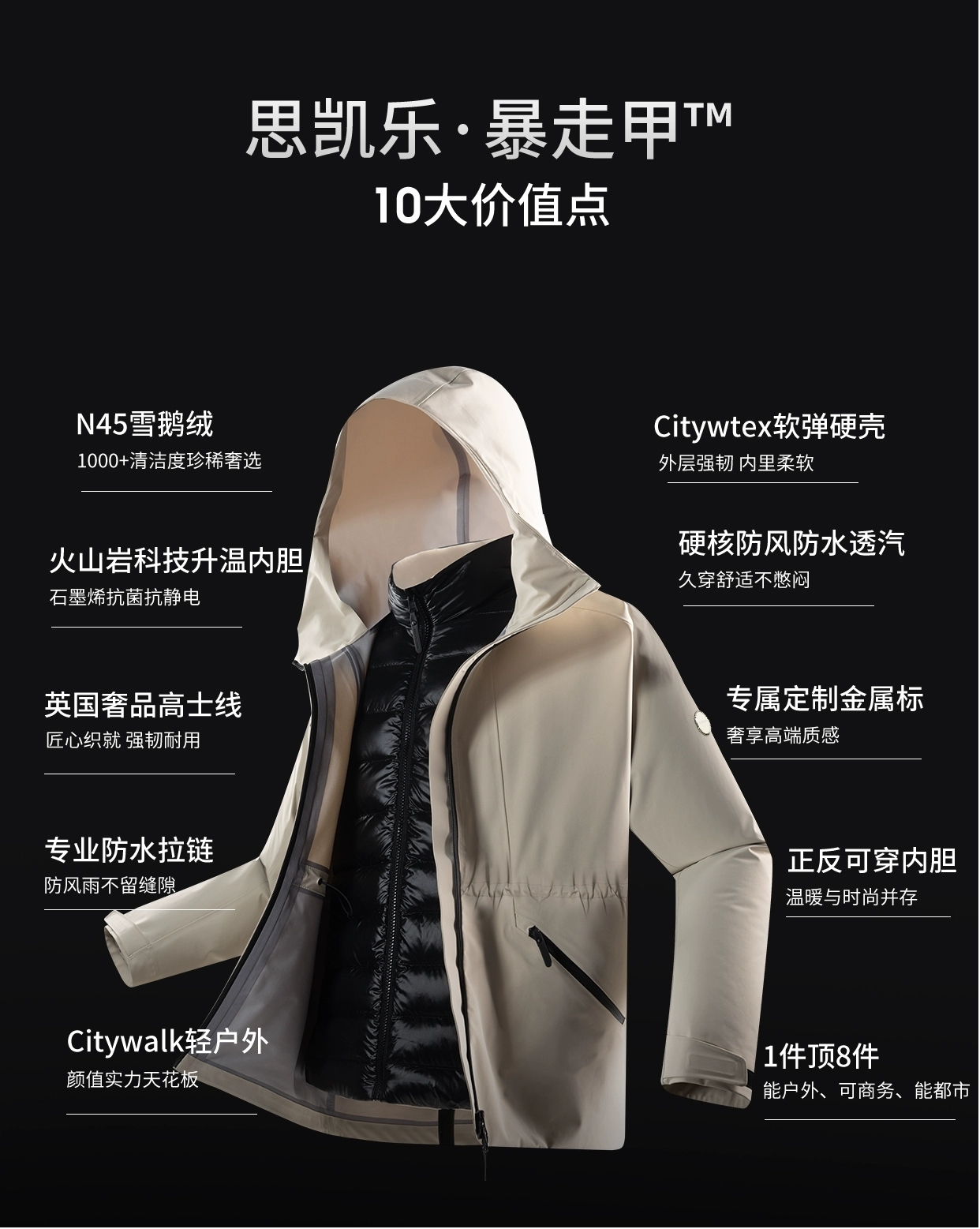 2025年秋,赛里木湖畔的户外大秀上,暴走甲的亮相为甲系列的程度写下浓墨重彩的一笔。这款被念念凯乐首席产物体验官俞敏洪和《俞你同业》嘉宾们评价为可城可野的四合一冲锋衣,精确击中现代东说念主“迁移火暴”和“驻防火暴”的痛点,竣事了从“专科硬壳”到“全场景笼罩和自主界说功能的终极户外驻防”的转化。